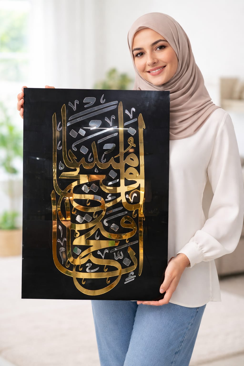 Made from high-quality premium acrylic with a luxurious golden mirror finish, this wall art reflects light beautifully and adds a rich, modern touch to any interior. The elegant calligraphy design blends traditional Islamic art with contemporary décor, making it a perfect statement piece for living rooms, prayer areas, offices, hallways, or entrance walls.