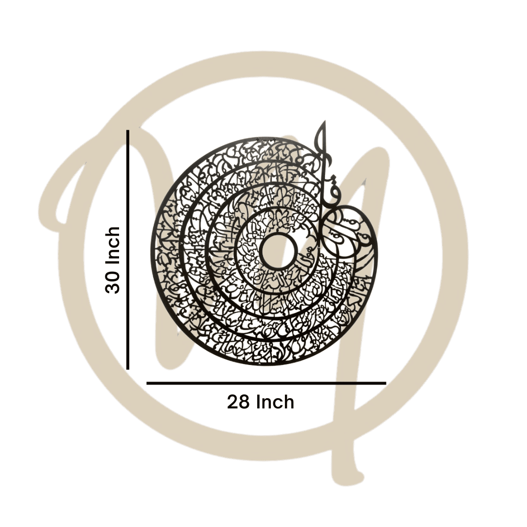 Inspired by the spiritual power of the Qur’an, Dir al-Qul is a stunning circular design that encases the four powerful Qul Surahs: Surah Ikhlas, Surah Naas, Surah Falaq, and Surah Kafirun. Crafted in elegant Arabic calligraphy, each layer forms a sacred circle with Surah Ikhlas at the center — symbolizing the foundation of Islamic faith.