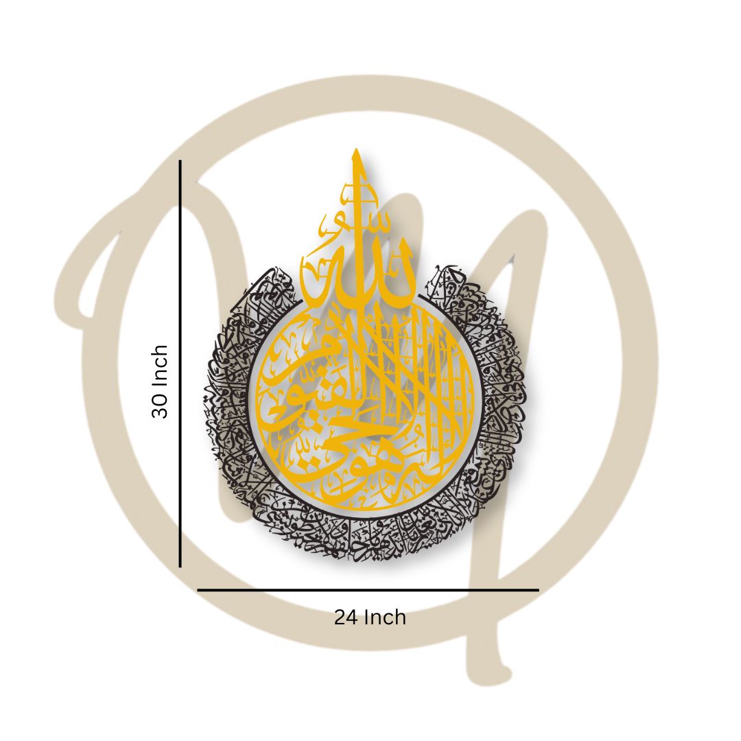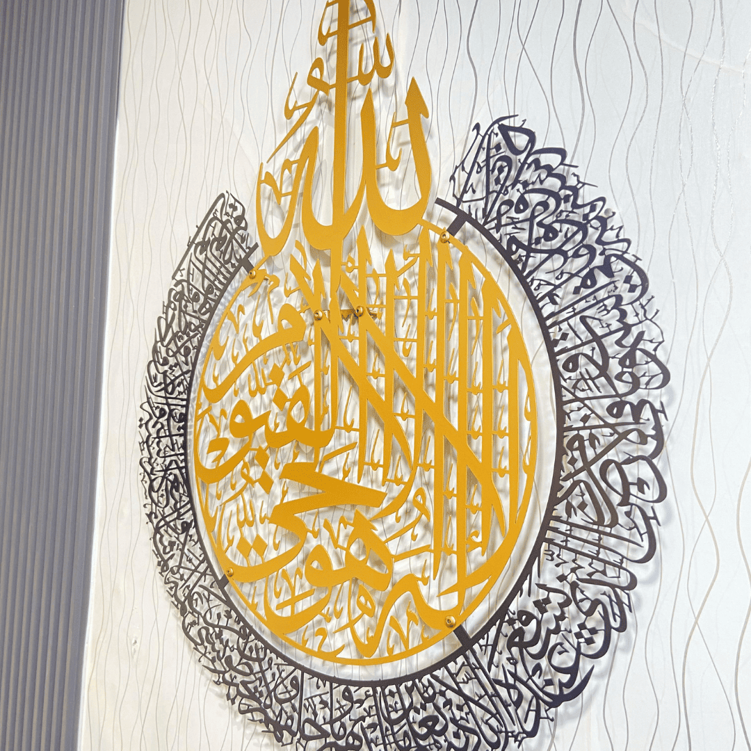 Bring home the divine presence of the Ayatul Kursi with our Dual Tone Black & Gold Metal Art. Meticulously designed in high-quality Mild Steel (MS), this piece blends durability with aesthetic excellence. The striking black and gold contrast not only enhances the verse’s spiritual significance but also adds a touch of grandeur to any wall.