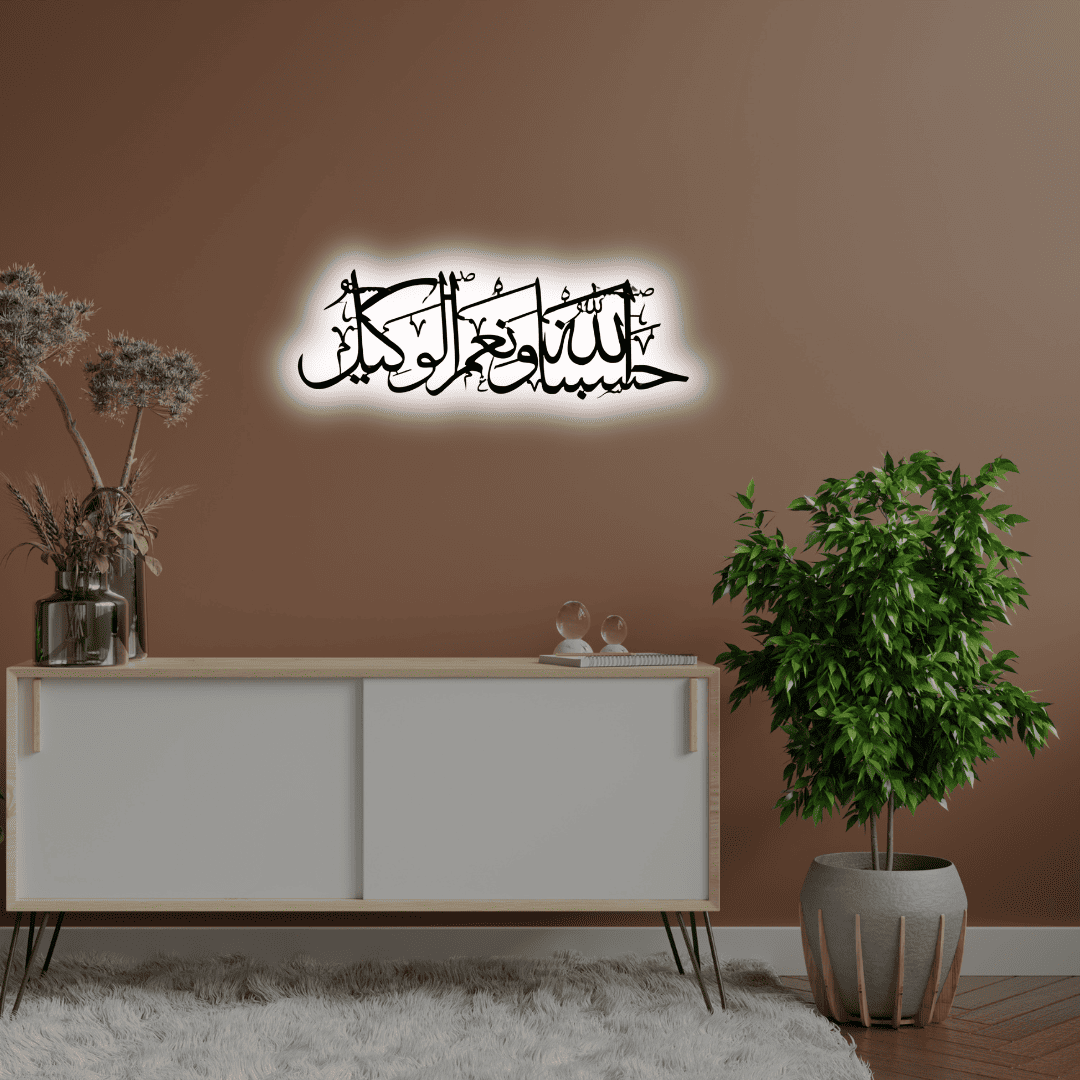 Let strength and serenity fill your space with our Hasbunallah Metal Art. Featuring the powerful phrase “Hasbunallah wa ni’mal wakeel” (Allah is sufficient for us, and He is the best disposer of affairs), this piece brings deep meaning and spiritual comfort to any room.