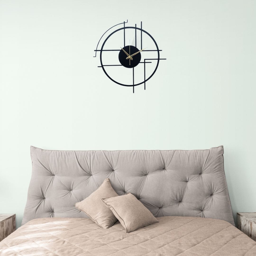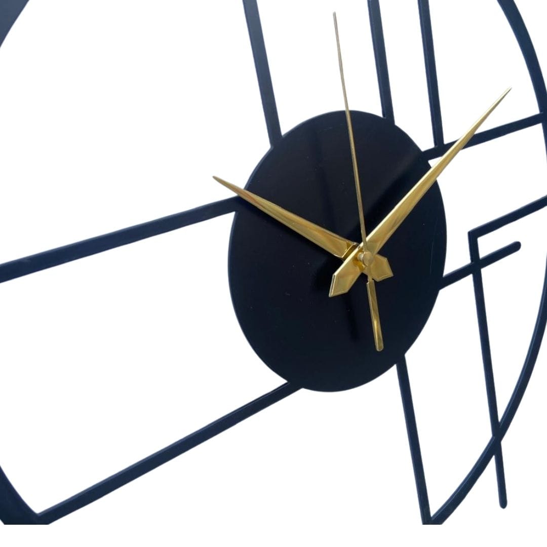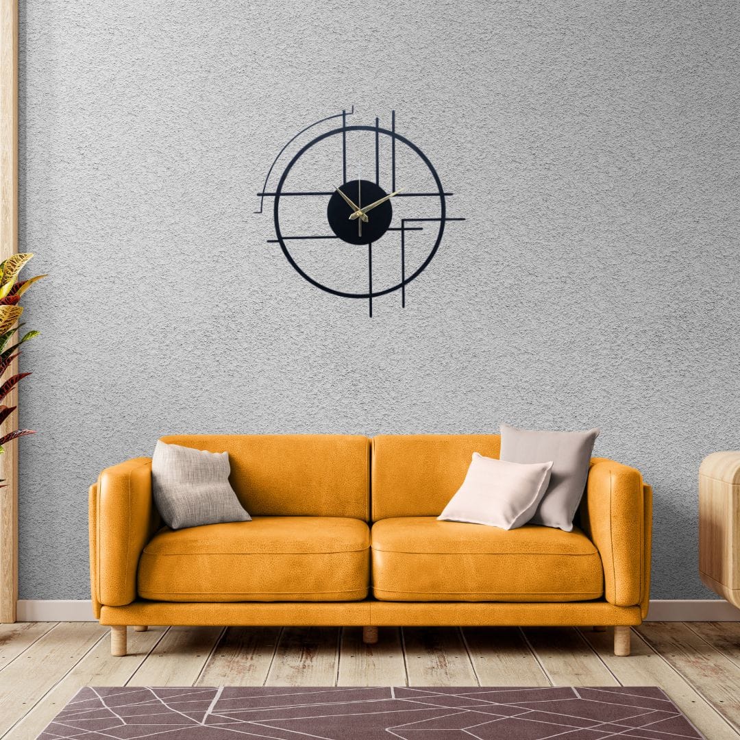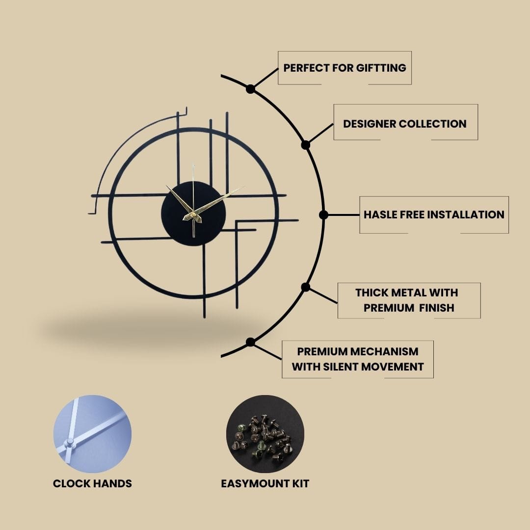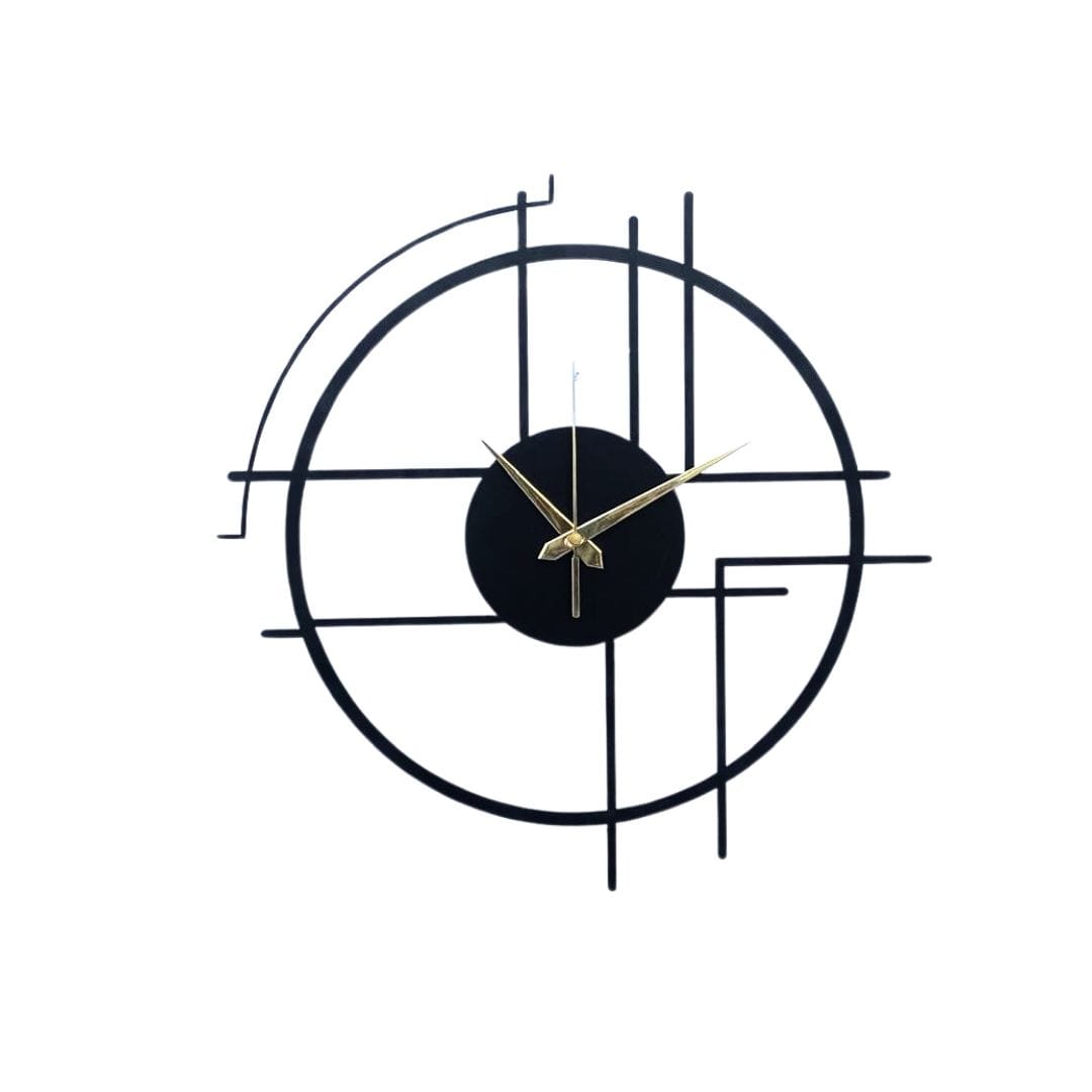 Crafted with a substantial thickness, the clock commands attention and exudes a sense of quality and durability. The design is a unique blend of geometric shapes, featuring a prominent circular frame that is intersected by linear elements, creating a dynamic and visually engaging composition. The interplay of lines and circles offers a modern interpretation of timekeeping, transforming a functional object into a piece of wall art.