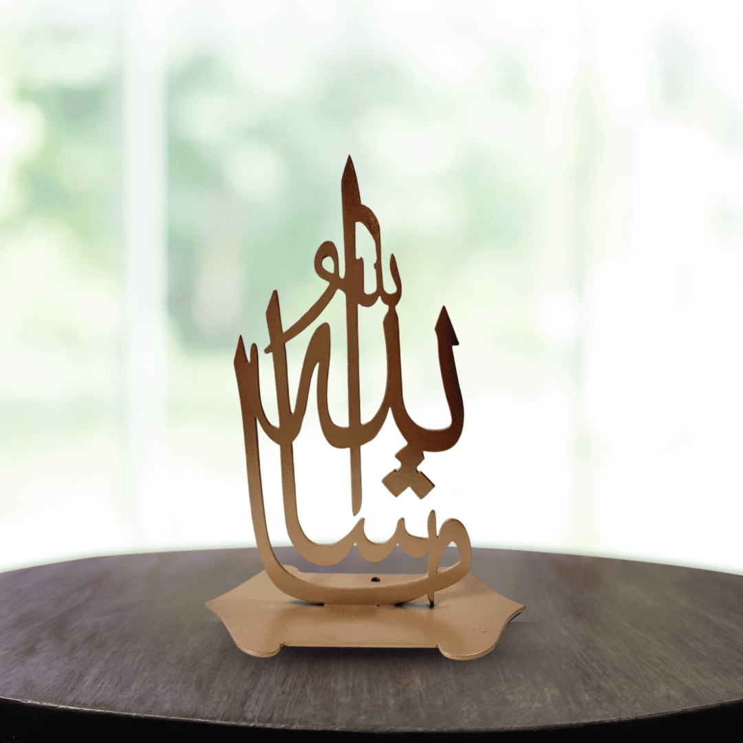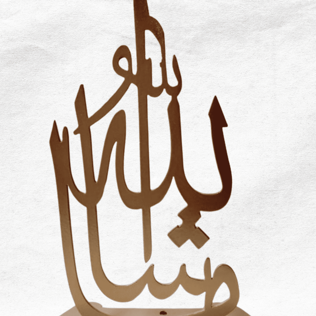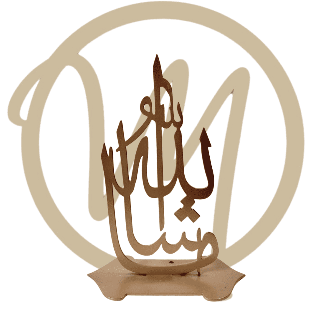 Display your appreciation for divine blessings with our Mashallah Table Art. This elegant metal piece is beautifully inscribed in Arabic calligraphy, symbolizing protection and barakah in your home. Compact and stylish, it’s perfect for shelves, desks, or decorative nooks.