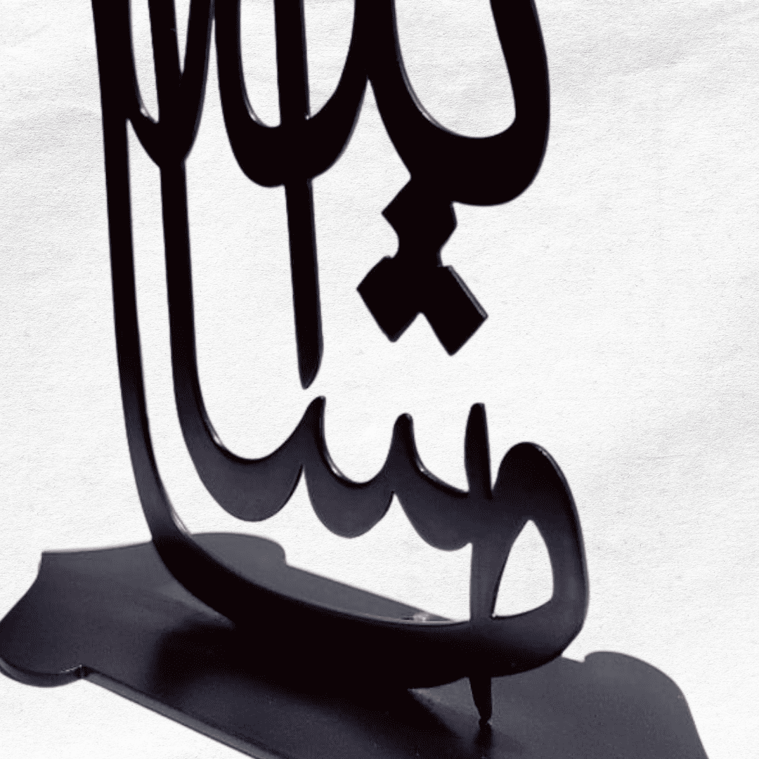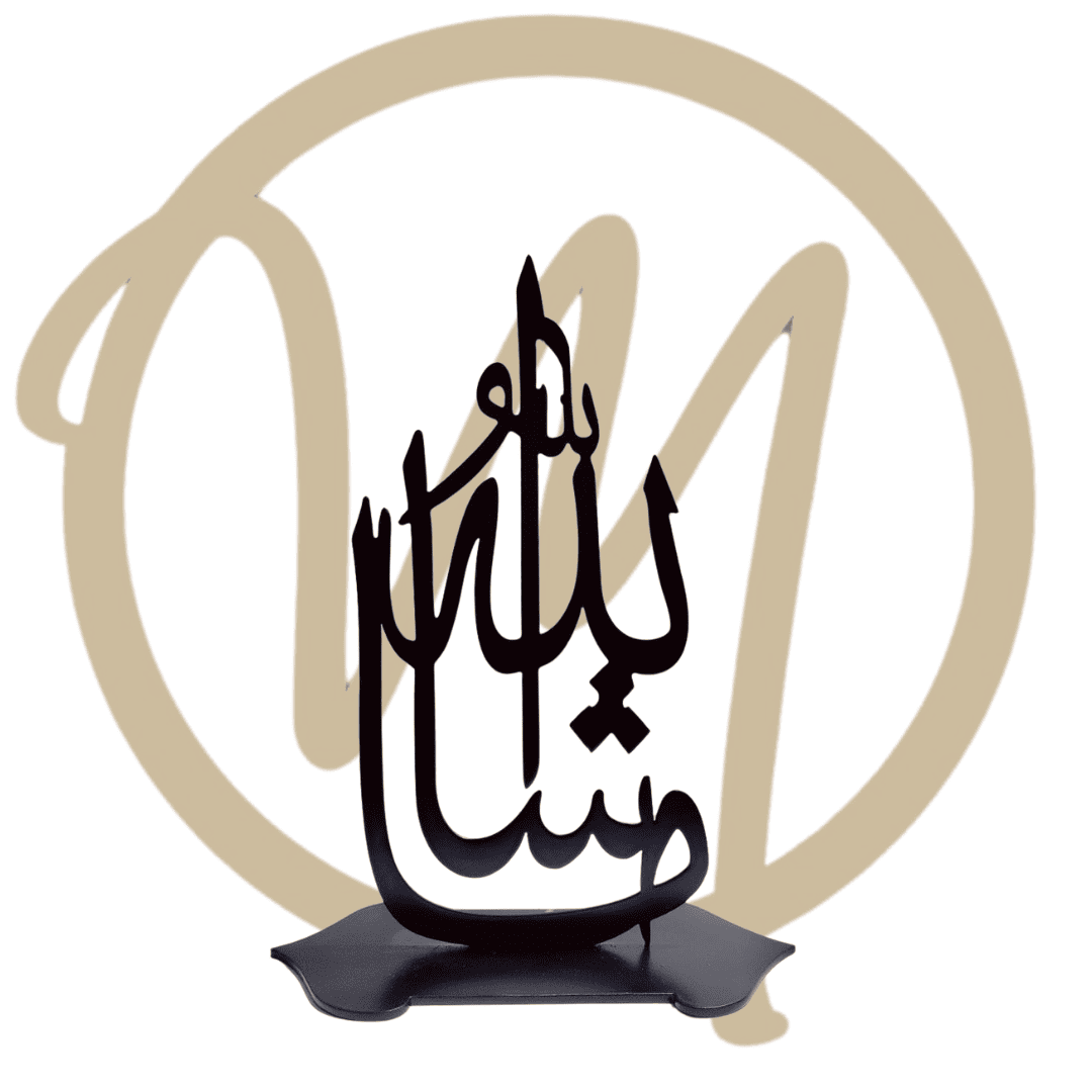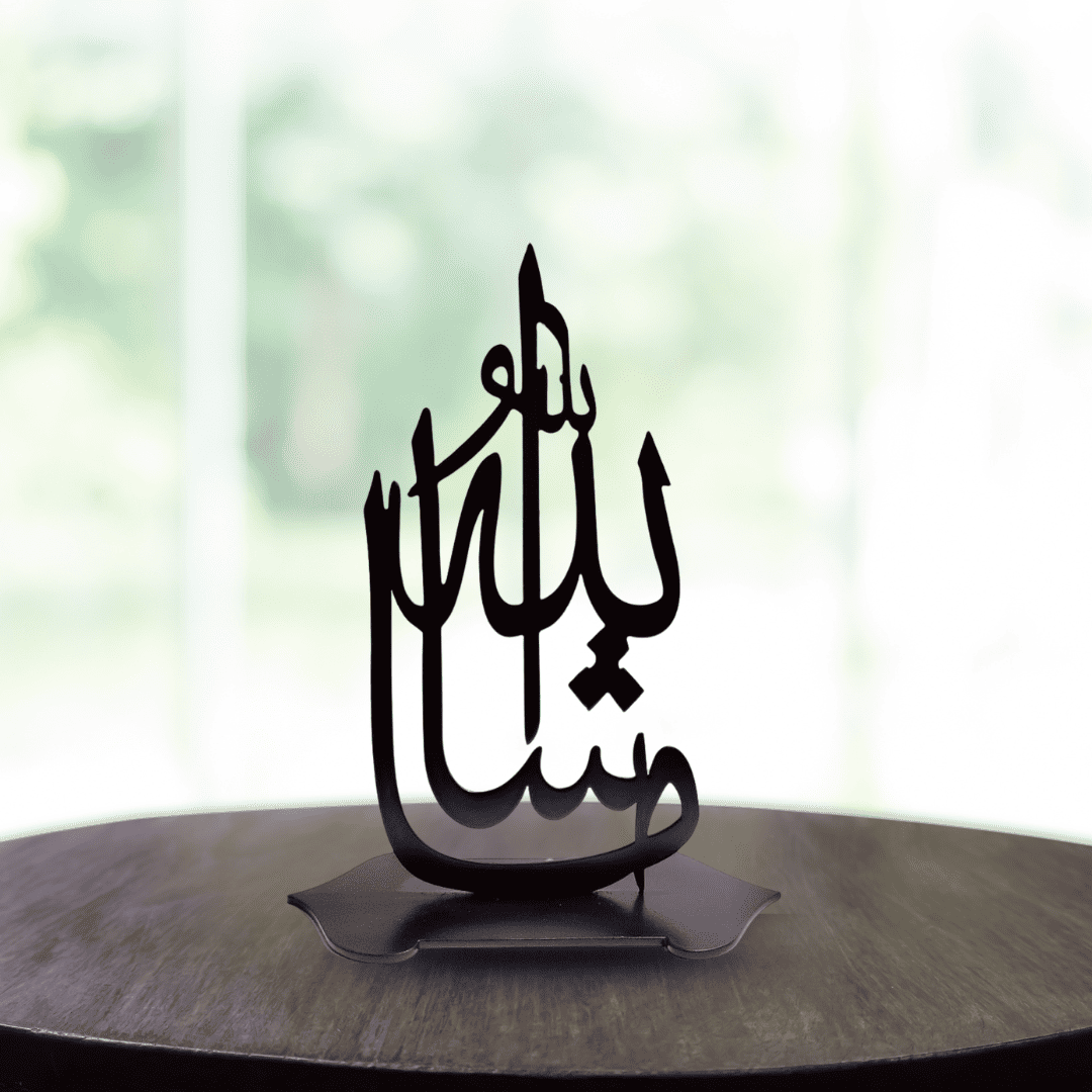 Display your appreciation for divine blessings with our Mashallah Table Art. This elegant metal piece is beautifully inscribed in Arabic calligraphy, symbolizing protection and barakah in your home. Compact and stylish, it’s perfect for shelves, desks, or decorative nooks.